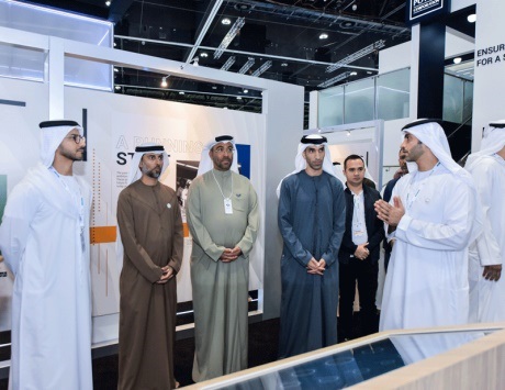 Their Excellencies Thani bin Ahmed Al Zeyoudi, Mohamed Al Mazrouei, Ahmed Ali Al Sayegh review energy-efficiency projects at ADDC stand at Abu Dhabi Sustainability Week 2020